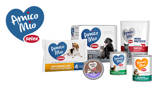 Una gamma completa di alimenti per cani e gatti che comprende umido, secco e snack, preparati con carni fresche, senza coloranti e no cruelty tested, a cui si aggiungono alcune referenze di base per l’igiene, come le lettiere e le traversine. Nell’assortimento è inoltre compresa una linea monoproteica e una di prodotti grain free, che escludono cioè l’uso di cereali. È infine disponibile anche Amico Mio Expert, composta da alimenti diversificati per età, razza e stile di vita degli animali domestici.