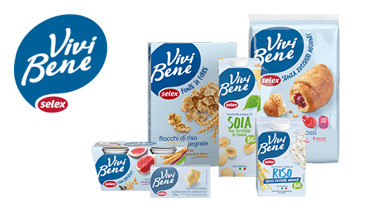 Una linea completa di alimenti salutistici. Oltre 90 referenze per ogni momento della giornata, dalla colazione al pasto, dallo snack alla tisana. Su ogni confezione sono evidenziate le caratteristiche del contenuto e il suo beneficio principale, per tutte le esigenze di benessere: per chi ha bisogno di ridurre i grassi o gli zuccheri come per chi desidera consumare più fibre o probiotici. Fanno parte della gamma anche i prodotti senza lattosio, differenziati dal logo Vivi Bene Selex di colore rosa.